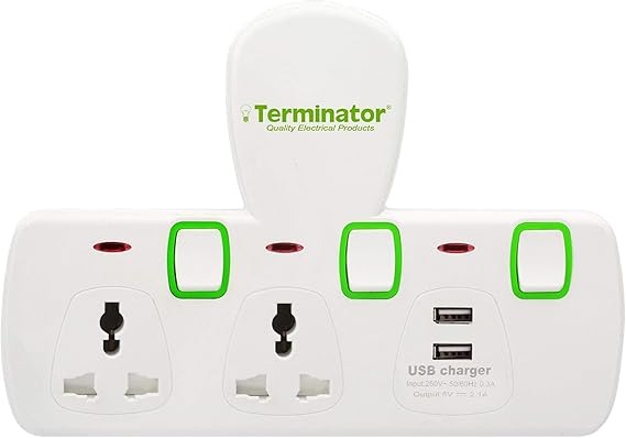Power your devices safely and efficiently with the Terminator 2 Way Universal T Socket with 2 USB Ports. Designed for modern homes and offices, this versatile socket supports multiple plug types, making it ideal for everyday electronics. It features two built-in USB ports for convenient charging of smartphones, tablets, and gadgets without extra adapters. Individual power switches with LED indicators provide enhanced control, safety, and energy efficiency. Crafted from durable, heat-resistant materials, it ensures reliable performance and long-lasting use. Compact and practical, this universal T socket is the perfect solution for organized, clutter-free, and smart power management.