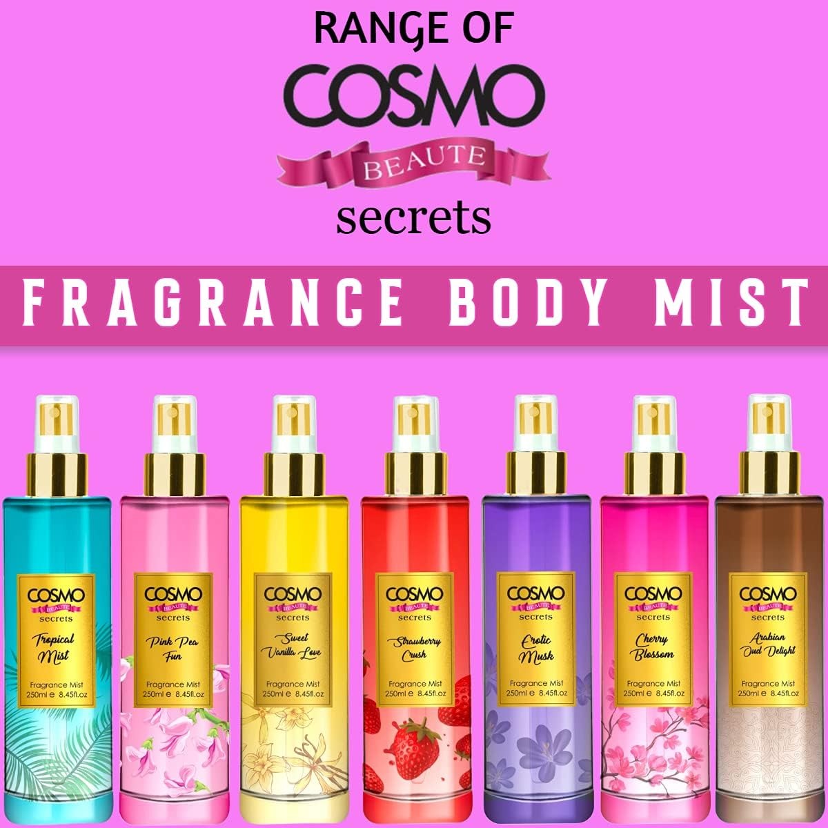 Cosmo Body Mist Pink Pea Fun, 250ml, is a refreshing and playful fragrance that keeps you feeling fresh and energized throughout the day. Infused with a light, fruity, and floral scent, it leaves a subtle, long-lasting aroma on your skin and clothes. The gentle, non-sticky formula sprays evenly, making it perfect for on-the-go use, school, work, or casual outings. Suitable for all skin types, this 250ml bottle offers a generous and convenient supply of delightful fragrance. Cosmo Body Mist Pink Pea Fun adds a fun, uplifting touch to your daily routine while keeping you confidently fresh..