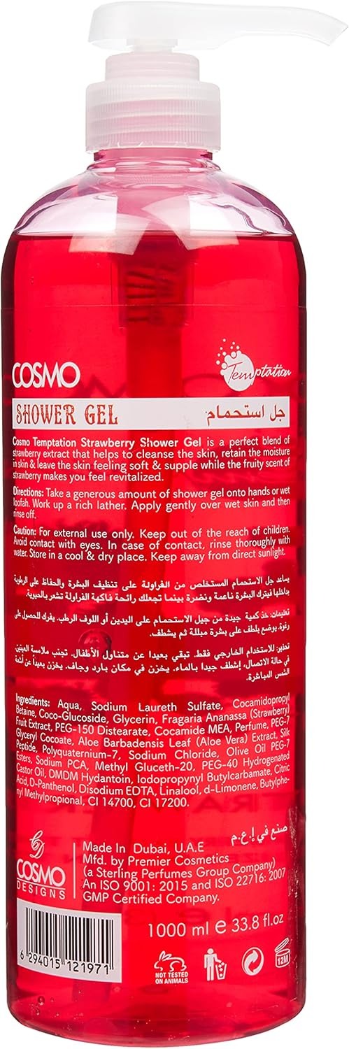 Cosmo Temptation Shower Gel Strawberry is a refreshing and gentle body wash that cleanses the skin while leaving it soft and delicately scented. Infused with the sweet, fruity fragrance of strawberry, it revitalizes your senses and makes every shower enjoyable. Its mild formula effectively removes dirt and impurities without drying the skin, helping to maintain natural moisture balance. Suitable for daily use, it leaves your skin feeling smooth, fresh, and nourished after every wash. Ideal for all skin types, this 1000ml family-size pack offers long-lasting freshness and value.