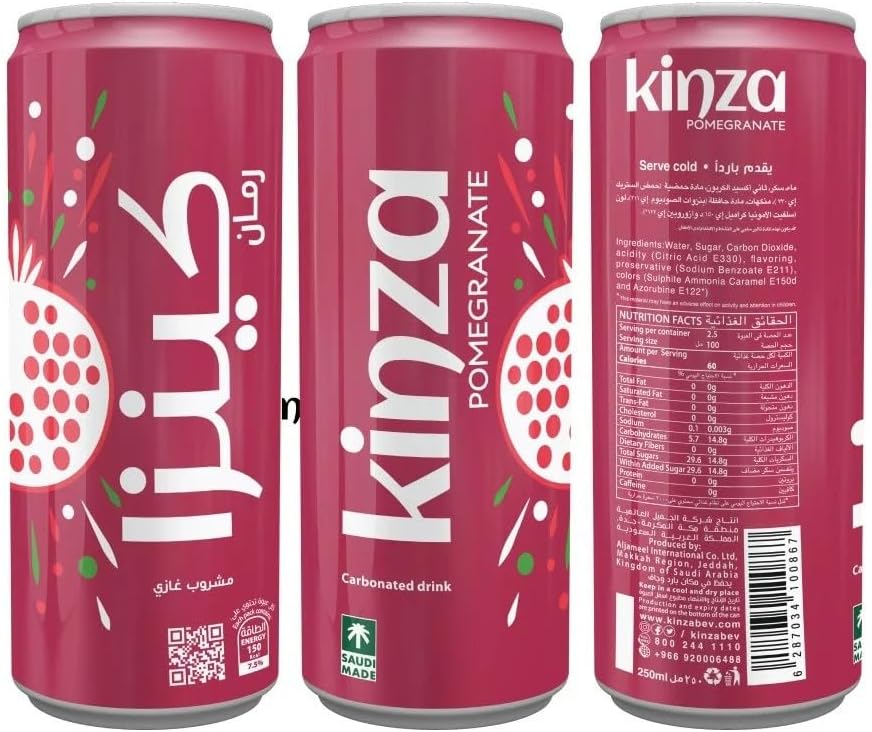 Kinza Pomegranate Carbonated Drink Can, 250ml is a refreshing fizzy beverage infused with bold and tangy pomegranate flavor. Packaged in a handy 250ml can, it’s perfect for quick refreshment, on-the-go enjoyment, lunchboxes, or casual gatherings. With lively carbonation and a vibrant fruity taste, it delivers a crisp and satisfying sip every time. Kinza Pomegranate Carbonated Drink combines unique pomegranate taste with bubbly refreshment, making it an ideal choice for anyone seeking a flavorful twist on classic soft drinks. Enjoy its cool, fruity fizz wherever you are!