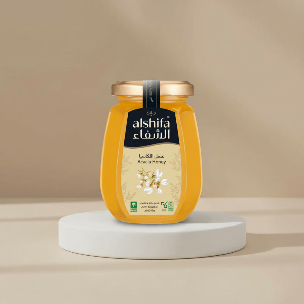 Al Shifa Acacia Honey (250g) is a premium, natural honey with a light color, smooth texture, and delicate taste. Sourced from high-quality acacia flowers, this honey remains liquid longer than regular varieties and provides a mild, naturally sweet flavor. Perfect for tea, toast, desserts, smoothies, and baking, it enhances both taste and nutrition. The 250g jar is convenient for everyday use and easy storage. Free from additives and preservatives, Al Shifa Acacia Honey delivers pure, natural goodness, making it a healthy and delicious choice for families, kids, and honey lovers.