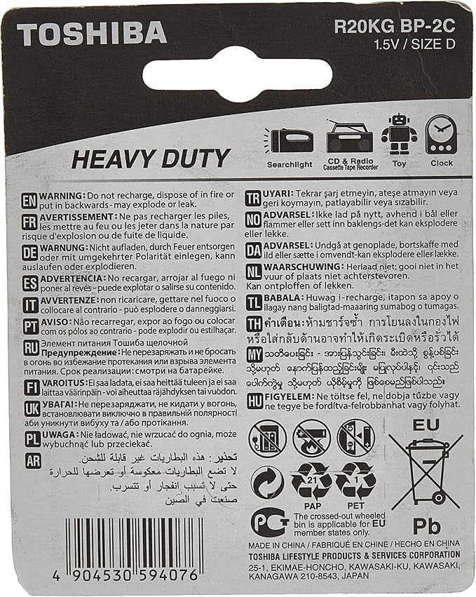 TOSHIBA 1.5V D Heavy Duty Batteries have stable discharge characteristics, excellent resistance to leakage and are for general usage. It is perfect for remote controllers, measuring devices, clocks and toys.