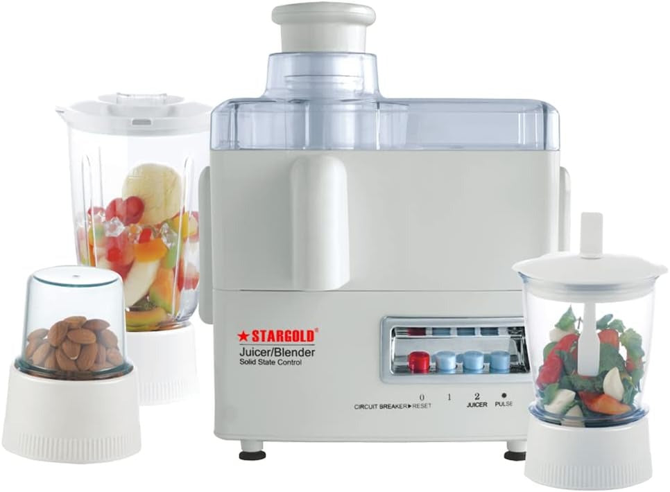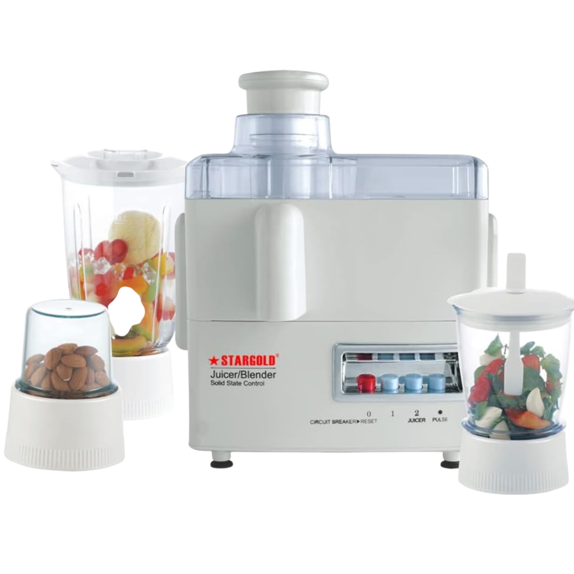 Upgrade your kitchen with the Stargold 4‑in‑1 Juicer & Blender — a versatile and powerful appliance that handles all your blending and juicing needs in one compact unit. Perfect for making fresh juices, smoothies, shakes, purees, sauces, and more, this multifunctional tool saves time and space. Its robust motor and quality blades ensure smooth, efficient blending and extraction for fruits, vegetables, nuts, and ice. Easy to assemble, use, and clean, it offers multiple attachments for maximum convenience. Whether you’re preparing healthy drinks or everyday recipes, the Stargold 4‑in‑1 Juicer & Blender delivers reliable performance and delicious results.