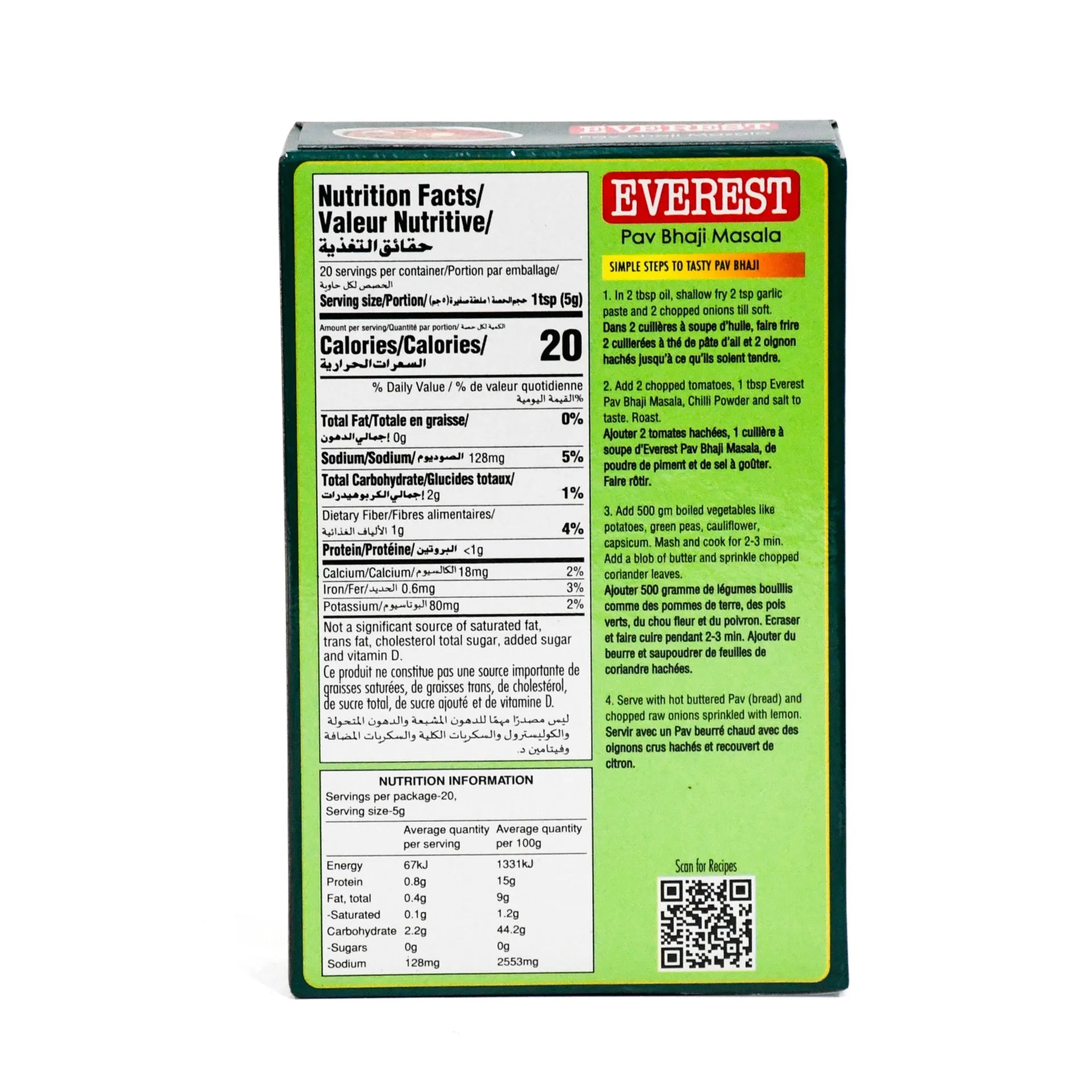 Everest Pav Bhaji Masala, 100 g is a premium spice blend specially crafted to bring authentic, rich flavor to your pav bhaji and other vegetable-based dishes. It combines high‑quality spices such as coriander, cumin, fennel, cloves, and more to deliver bold, aromatic taste with a perfect balance of heat and tang. Ideal for preparing classic pav bhaji, mixed vegetable curries, and snacks, this masala enhances every bite with vibrant color and rich, savory flavor. The 100 g pack is a convenient kitchen essential, offering consistent quality and authentic taste every time you cook.