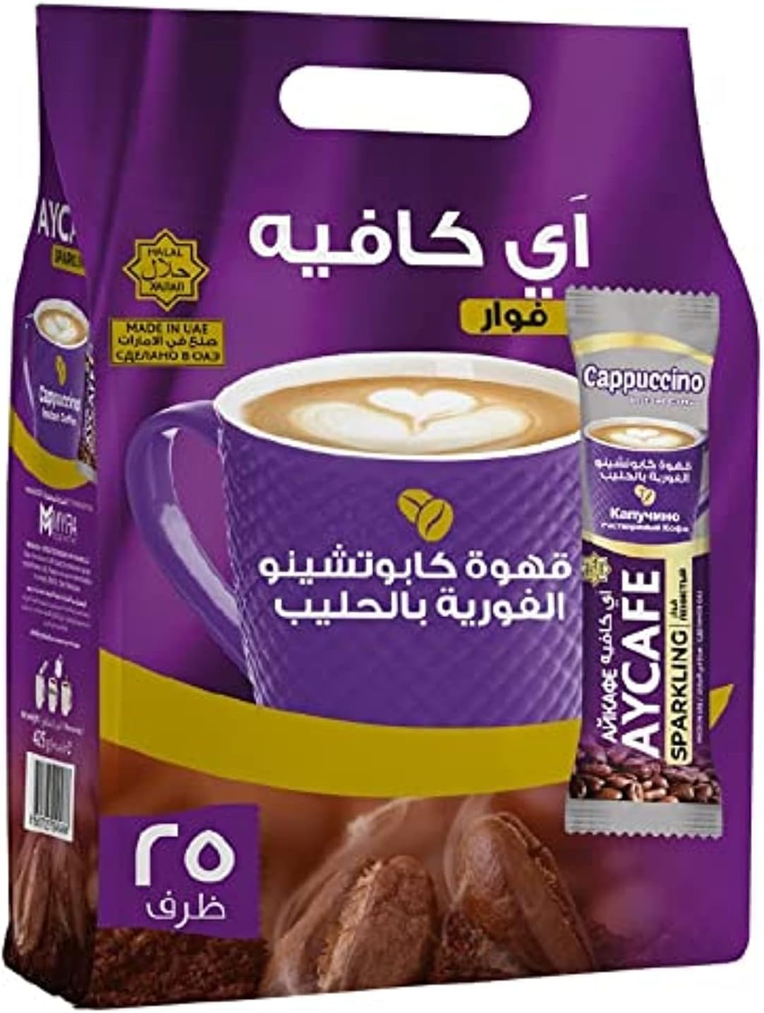 Aycafe Sparkling Instant Coffee – Cream Cappuccino, 25 x 20g, offers a unique and delightful coffee experience with a creamy, frothy texture and rich cappuccino flavor. Each sachet is crafted for instant preparation—just add hot water to enjoy a smooth, indulgent cup anytime. Perfect for home, office, or on-the-go, it combines the convenience of instant coffee with the luxurious taste of a café-style cappuccino. The pack contains 25 individually portioned sachets, ensuring freshness and consistent flavor with every cup. Aycafe Sparkling Cream Cappuccino delivers a sparkling, satisfying coffee experience for coffee lovers seeking both taste and convenience.
