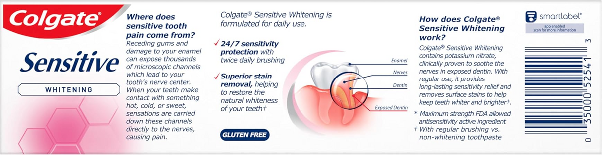 Protect your teeth and brighten your smile with Colgate Sensitive Whitening Toothpaste. Specially formulated to gently soothe sensitivity while effectively removing surface stains, it helps you enjoy a whiter, healthier-looking...