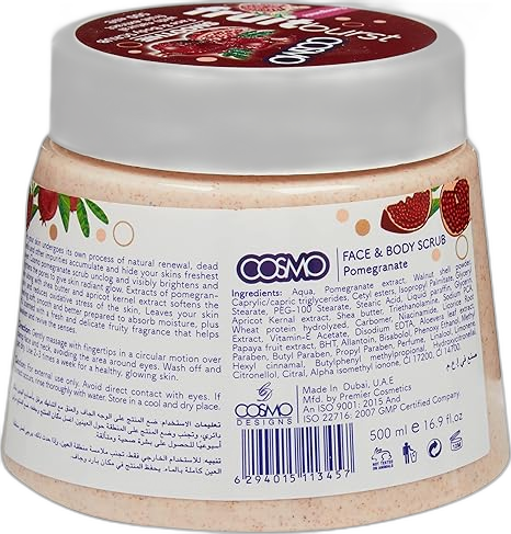 Revitalize your skin with the COSMO Pomegranate Face & Body Scrub, a refreshing exfoliant designed to gently remove dead skin cells and impurities. Infused with pomegranate, it helps brighten and nourish your complexion, leaving your face and body feeling smooth, soft, and rejuvenated. Ideal for a deep clean that enhances skin’s natural glow and promotes a healthy, radiant look.