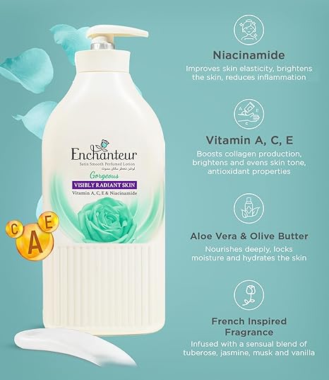 Indulge your skin in the luxurious touch of Enchanteur Gorgeous Body Lotion. This lightweight lotion absorbs quickly, leaving your skin beautifully soft and delicately scented with a feminine, captivating fragrance. Perfect for daily use, it helps you feel confident and radiant all day long.