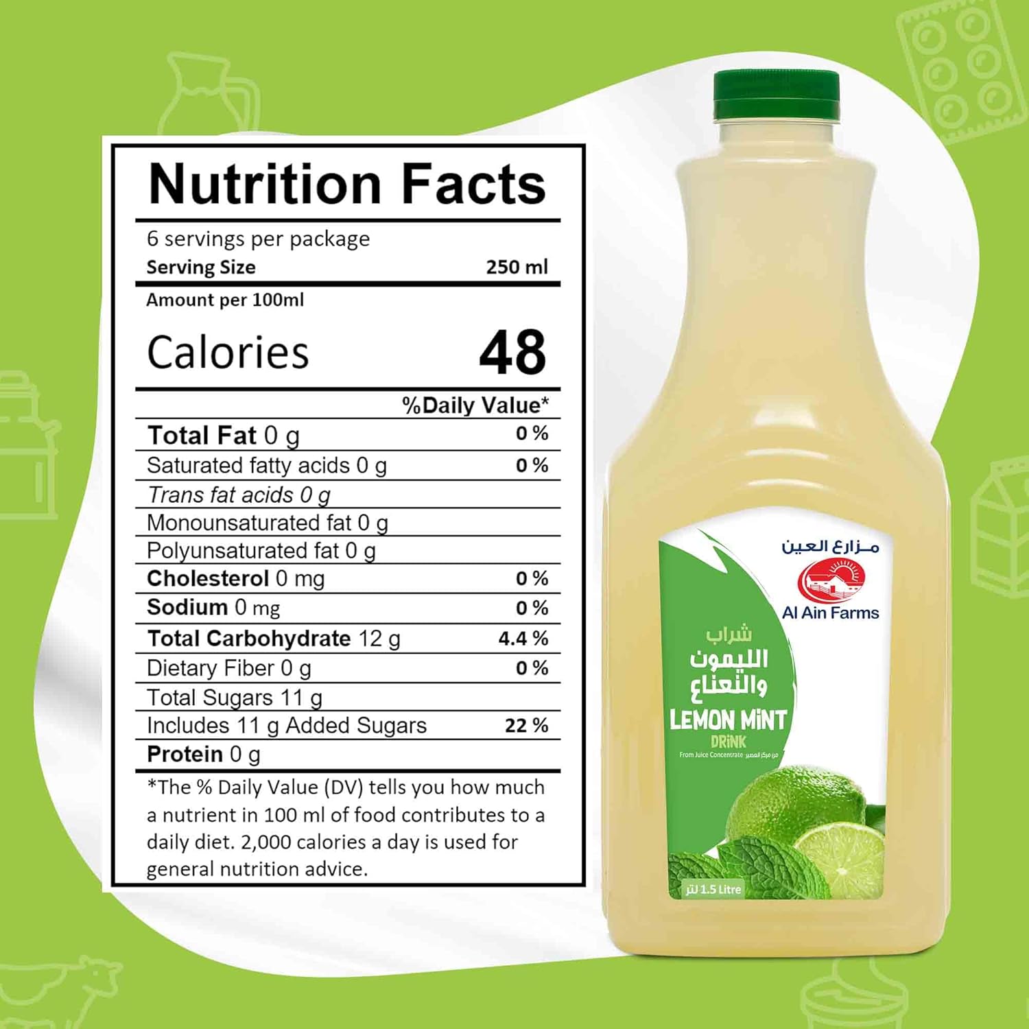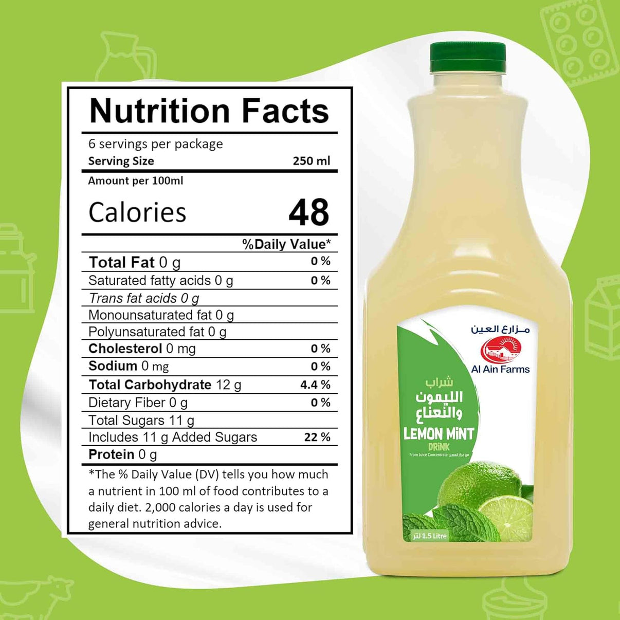 Al Ain Farms Lemon Mint Drink, 1.5 L is a refreshing ready‑to‑drink beverage combining zesty lemon and cool mint flavours for a crisp and thirst‑quenching experience. Packaged in a generous 1.5‑litre bottle, it’s ideal for family meals, hot days, picnics, and everyday hydration. The vibrant citrus‑mint blend offers a bright taste that’s perfect served chilled and pairs well with snacks or meals. Made with quality ingredients, this lemon‑mint drink delivers a revitalising flavour that appeals to all ages and helps cool you down anytime you need a refreshing boost.