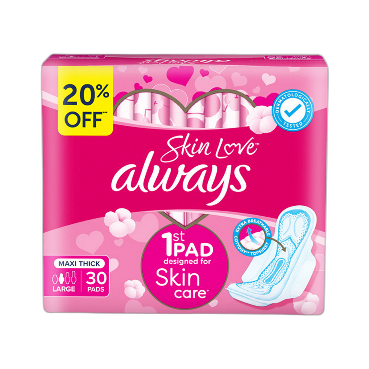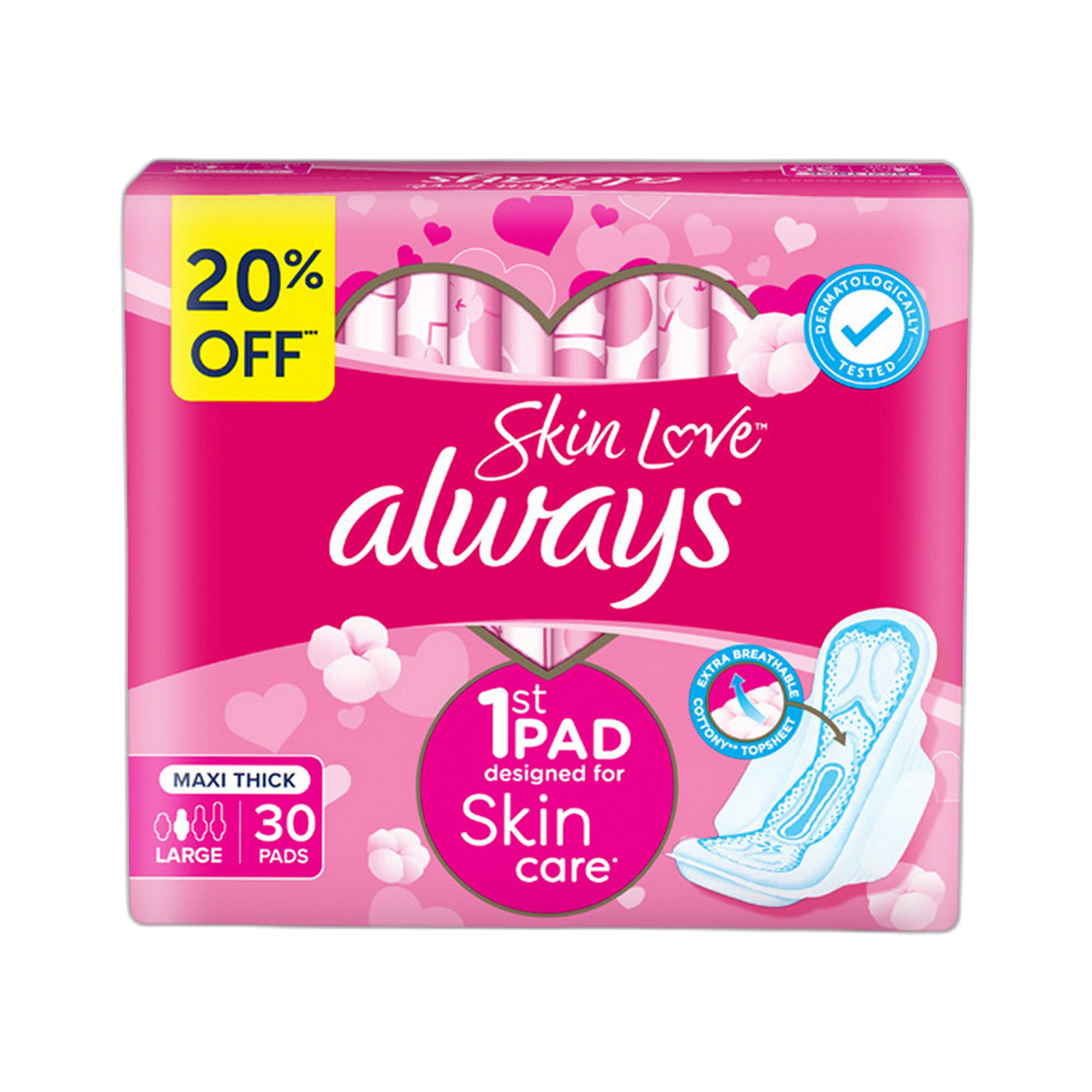 Experience reliable comfort and protection every day with SKIN LOVE ALWAYS MAXI 30PADS. Designed for maximum absorbency, these pads help you stay confident and fresh through your busiest moments. Soft and breathable, they provide gentle care while keeping you comfortable all day long.